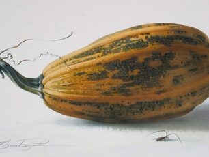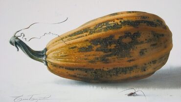 В изображении завитушек тыквенных побегов мы найдем замечательный пример для освоения техники написания изящных и тончайших элементов без белил и резерважа на темном фоне. В изображении мешковины – пример живописи драпировки с необычной фактурой. Плотные бока тыкв, окрашенные природой в разные цвета – настоящий простор и удовольствие для освоения различных приемов живописи акварелью.