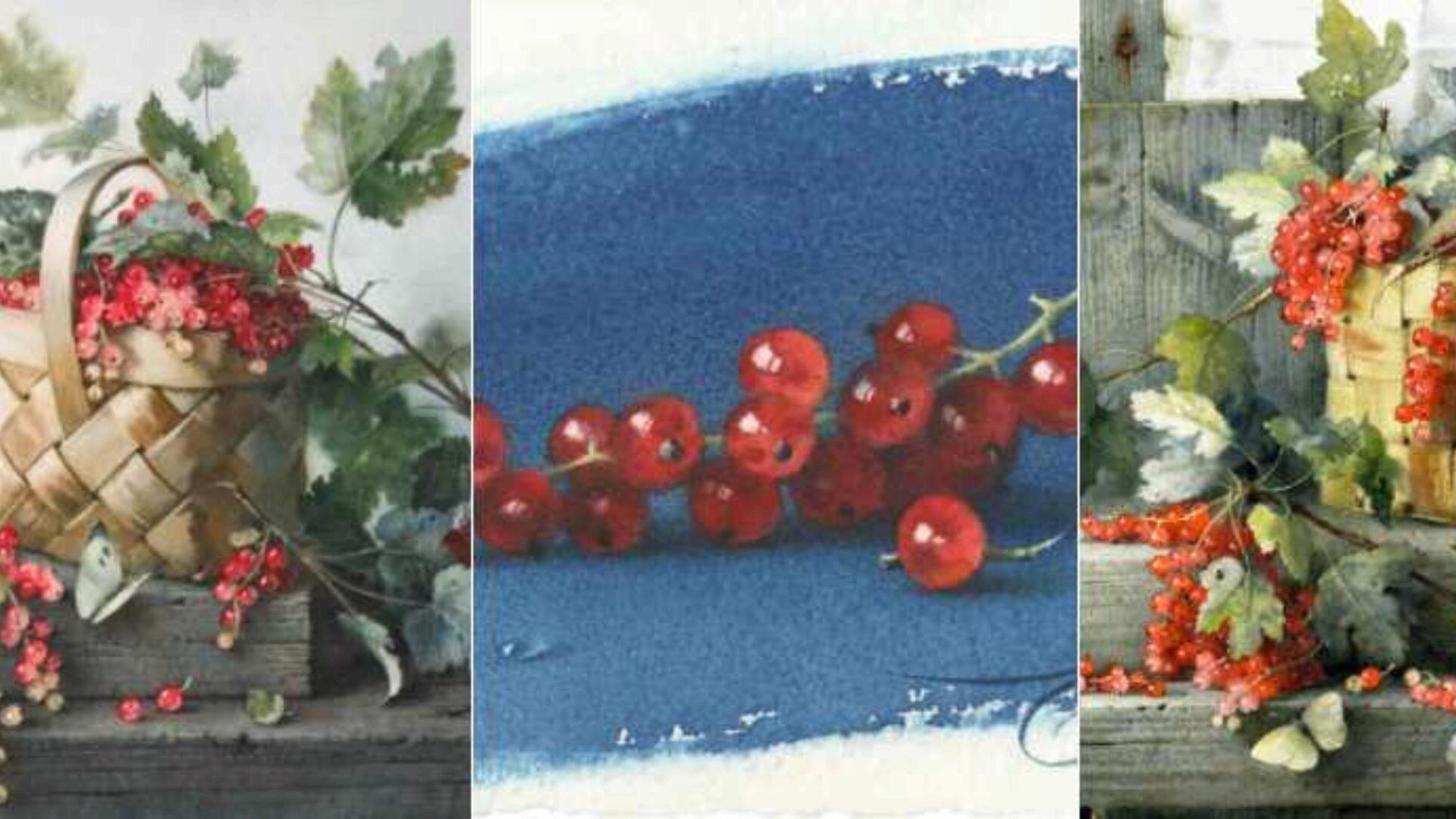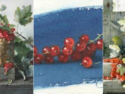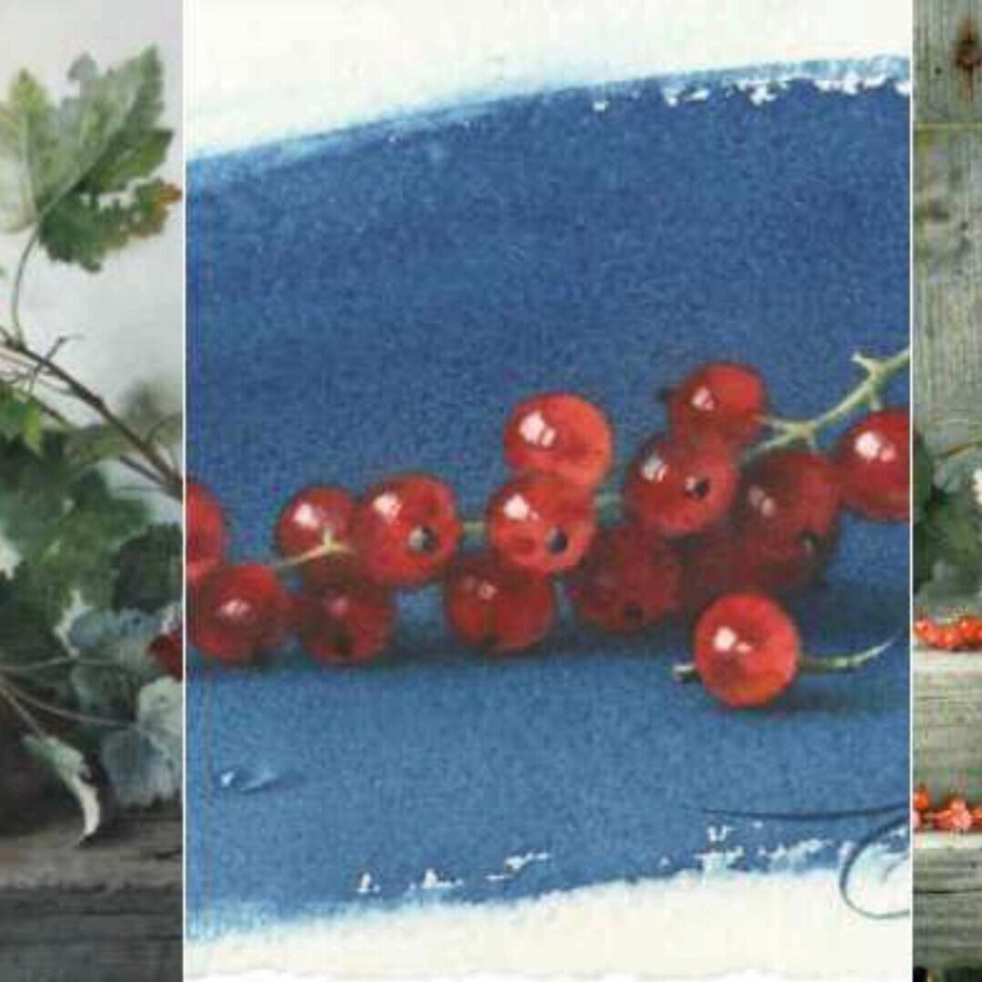 Также вы продолжите изучать секреты смешения красок: как писать чистые яркие красные сочетания в ягодах и как писать зеленые листья без зеленых красок.