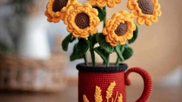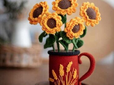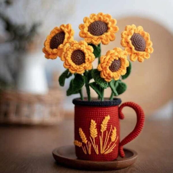 При использовании указанных в мастер-классе материалов подсолнухи в кружке получаются размером: 20-22 см в высоту.