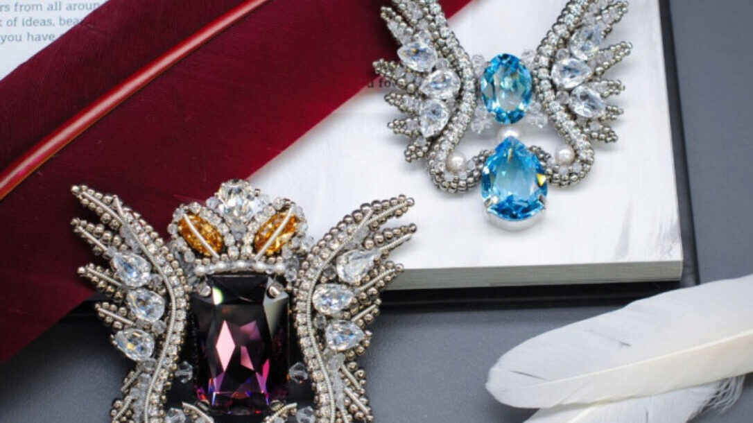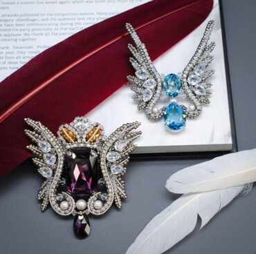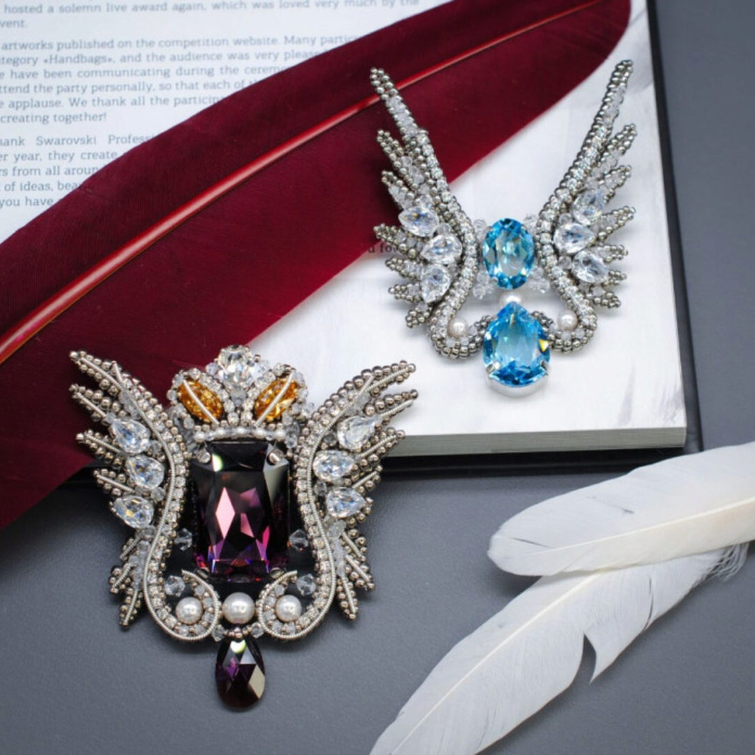 Брошь полностью выполнена в технике бисероплетения с использованием кристаллов, бусин, канители, стразовой цепочки. Размер готового украшения 6,5*7 см.
