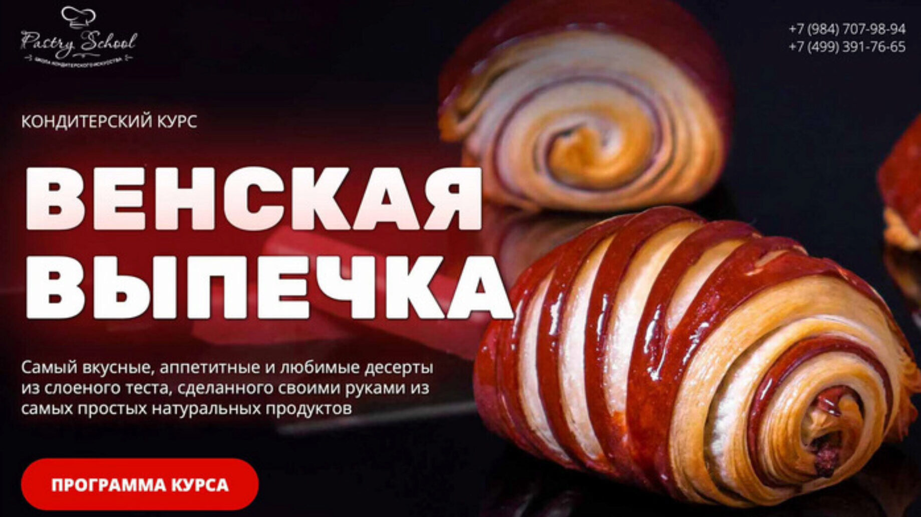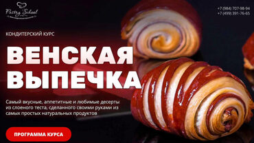 Венская сдоба - синоним роскоши на столе, это вершина кулинарного искусства! Программа курса «Венская выпечка»: Краффины: ромашка, цилиндр, кросс-краффин Круассаны: круглые, прямоугольные, плоские, закусочные, классические, с начинкой, ленивые, цветные Слоёные изделия оригинальных форм: с фруктами,