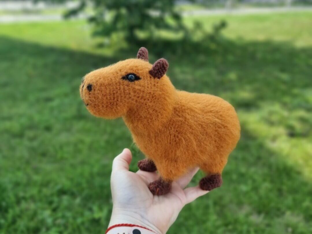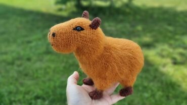 Капибара вяжется очень быстро, без единой пришивной детали, тело ввязывается в голову, ушки надвязываются сверху на готовой игрушке. Пряжи требуется минимум, на одну игрушку понадобится всего лишь 25-30 грамм пряжи. Размер игрушки 10см в длинну, в зависимости от пряжи, номера крючка и плотности