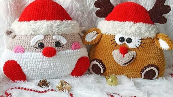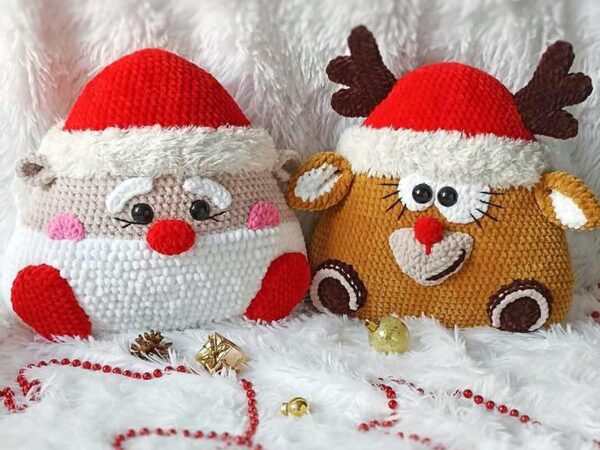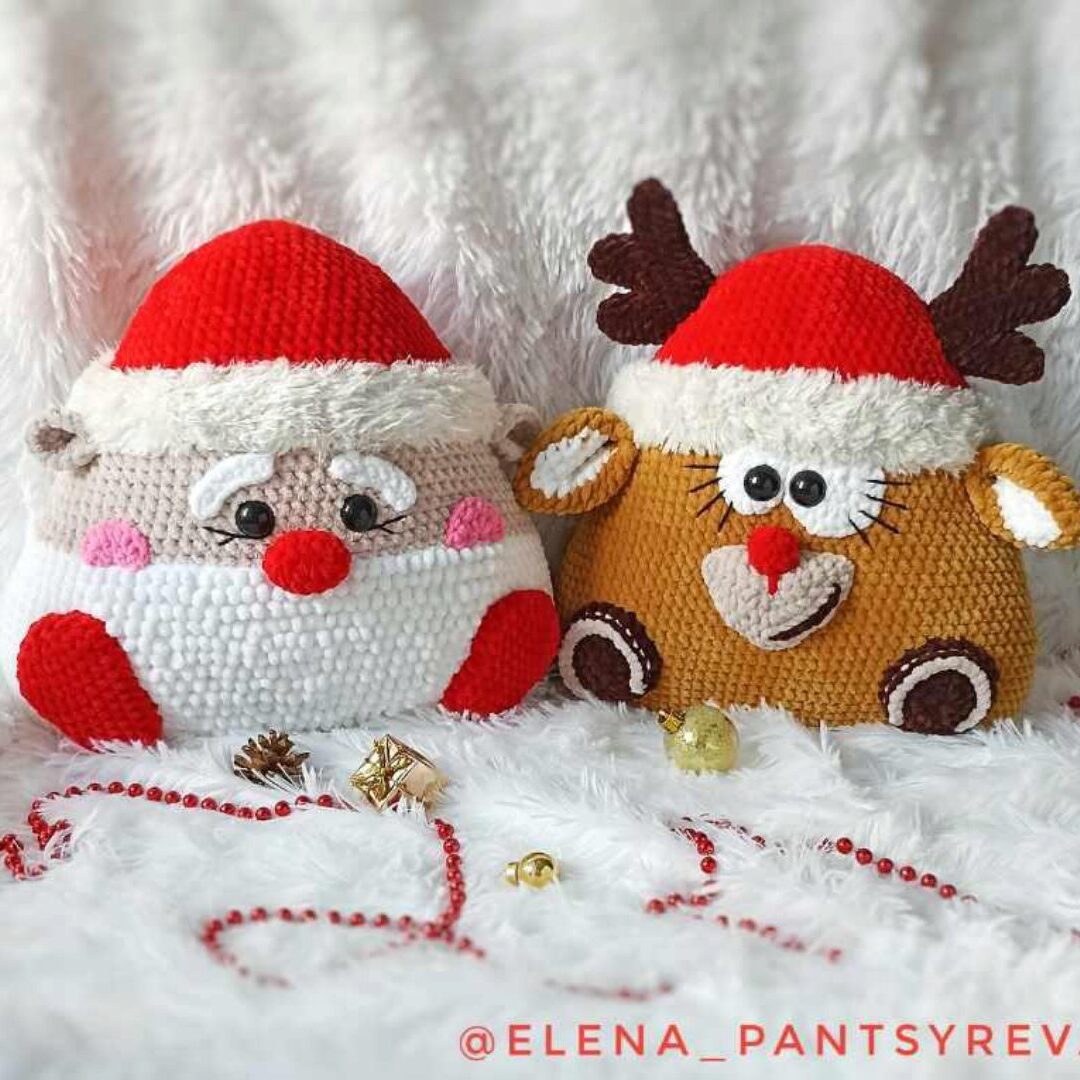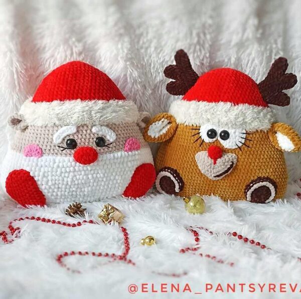 Елена Панцырева «Подушка Зверушка Новогодняя. Олень и Дед Мороз крючком»