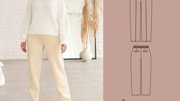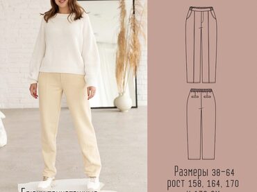 Выкройка представлена в размерах 40-60 на рост 158-164см. Свободные трикотажные брюки, зауженные к низу, с карманами, высокая посадка до линии талии, цельнокроеный пояс и цельнокроеные манжеты по низу брючин с эластичной тесьмой внутри. В комплект для скачивания входит 2 файла: для печати на А4 и