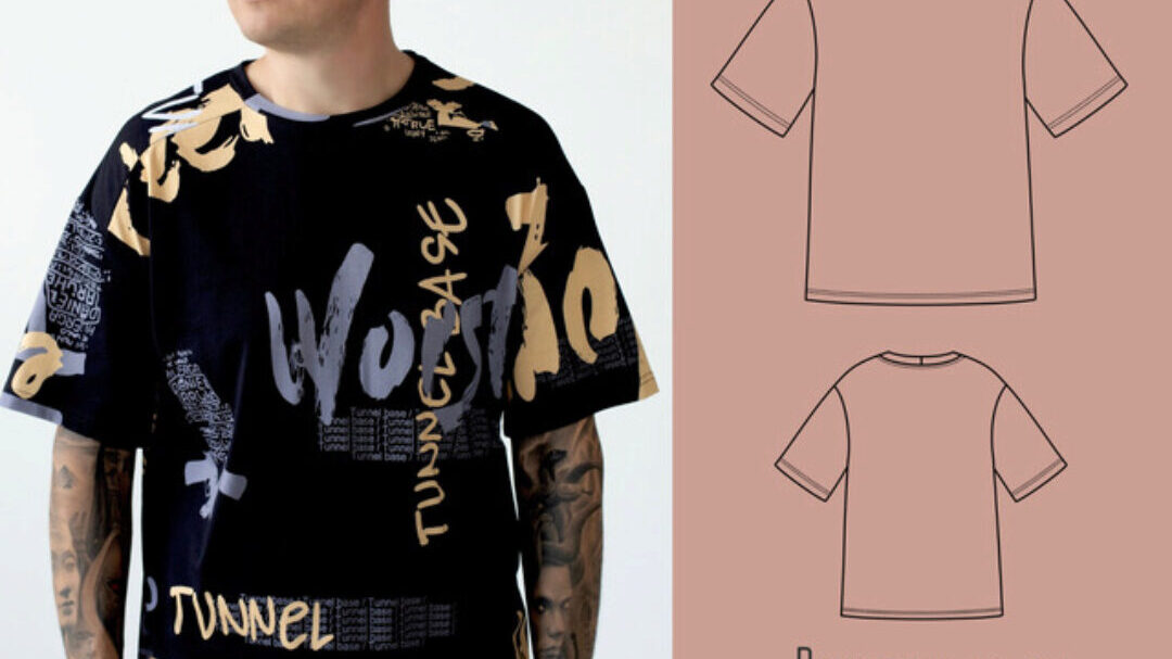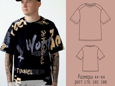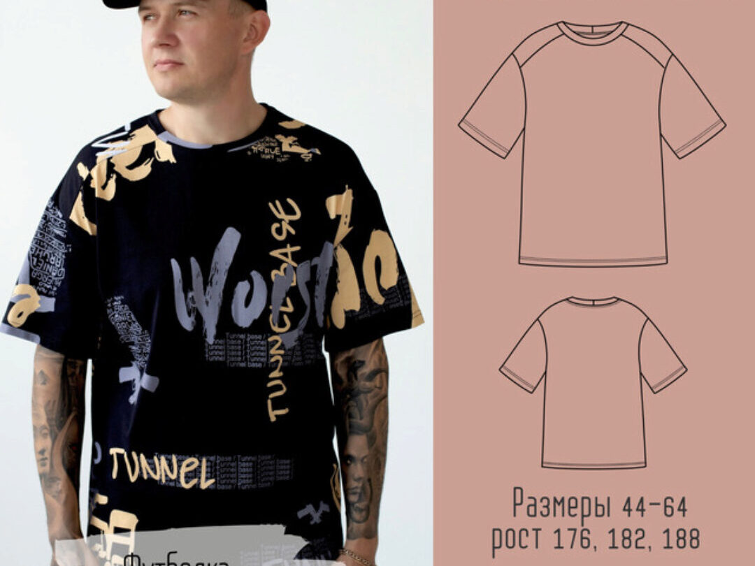 Выкройка мужской футболки большого объема, прямого силуэта. Линия плеча расширена, Вырез горловины круглый, обработан бейкой. Рукав втачной, длиной до локтя. Длина футболки ниже линии бедер.