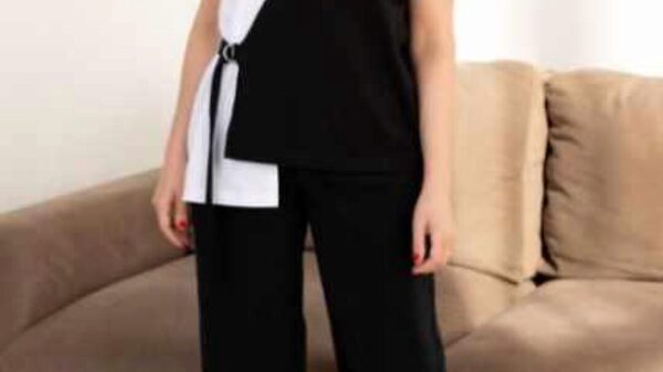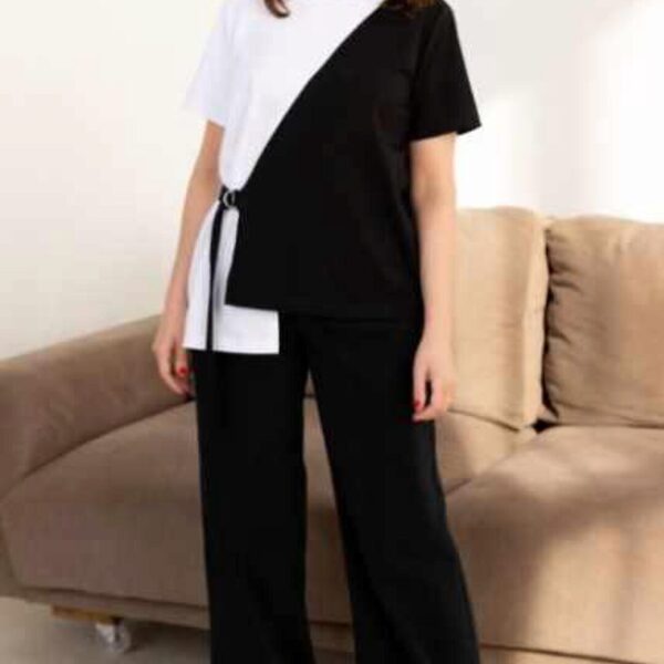 Короткий рукав, горловина обработана двойной притачной обтачкой из основного трикотажа или из рибаны/кашкорсе, в правый боковой шов вшит пояс, который фиксируется на полукольца.