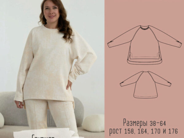 Выкройка представлена в размерах 40-60 на рост 170 см. Футболка (лонгслив) свободного кроя, прямого силуэта, плечо немного спущено. Два варианта длины рукава – короткий и длинный с манжетой по низу рукава. Два варианта обработки горловины – окантовка бейкой на распошивальной машине, либо обтачкой