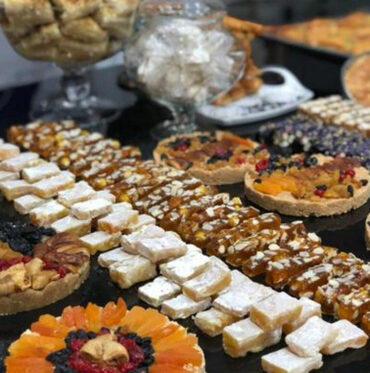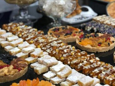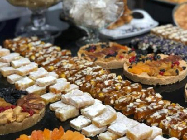 - Большой ассортимент восточных сладостей, от мягких конфет до сухой выпечки.