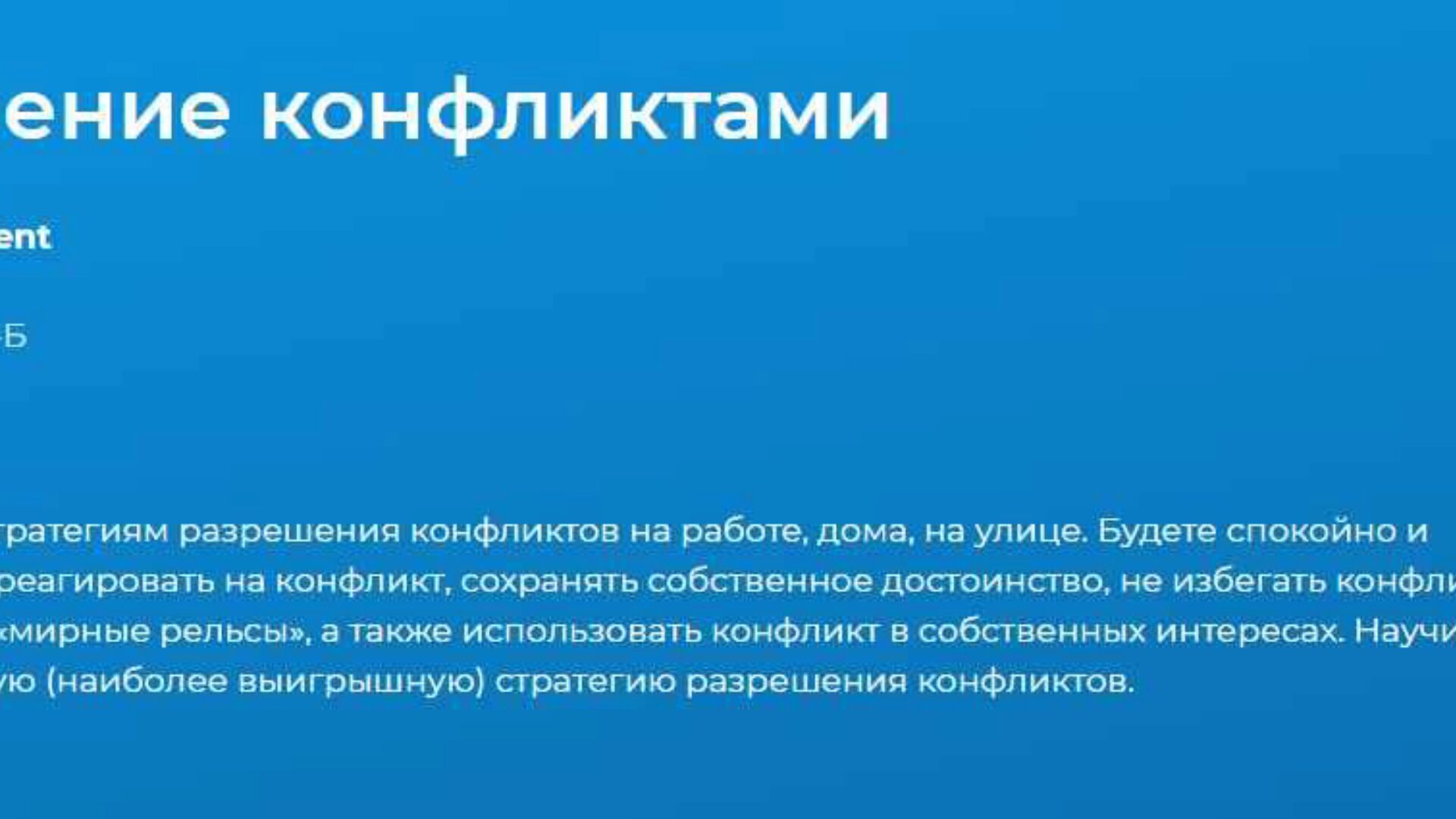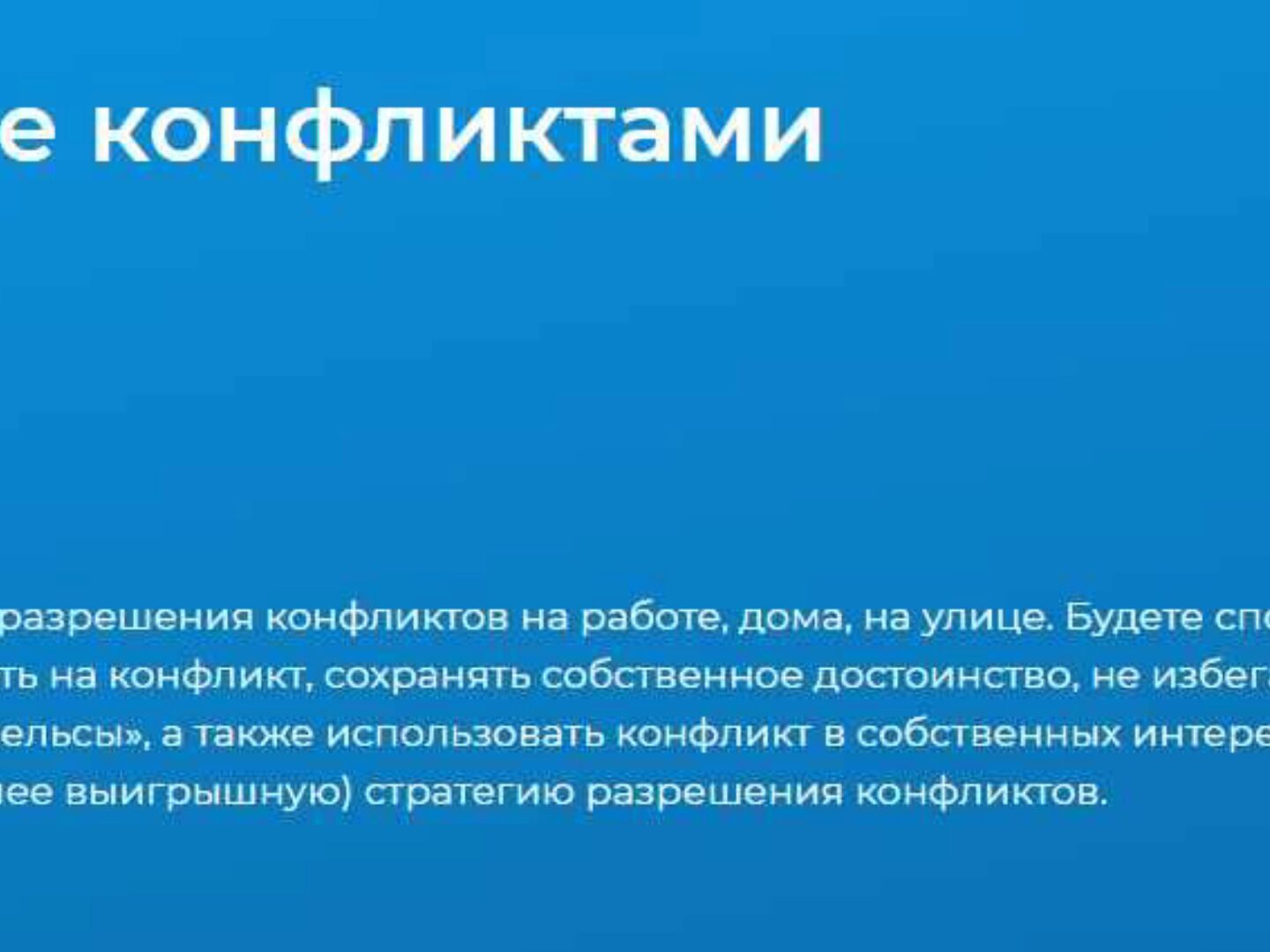 На курсе «Управление конфликтами» Вы рассмотрите конфликты с объективной, управленческой точки зрения, Вы поймете их происхождение, научитесь распознавать факторы, лежащие в основе конфликтов, и в конечном итоге - управлять ими.