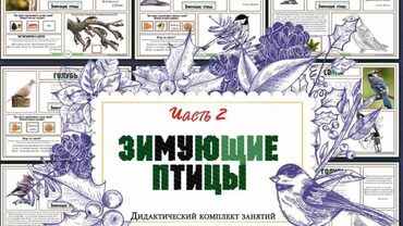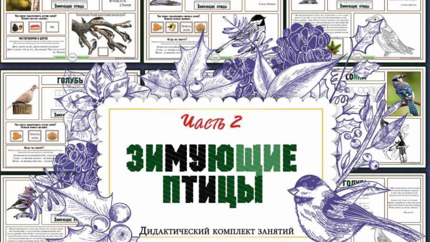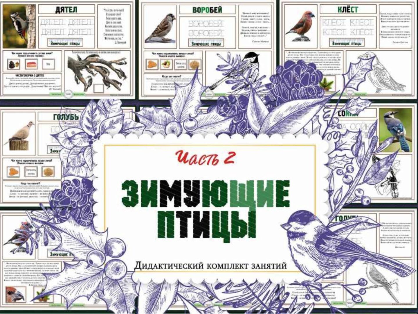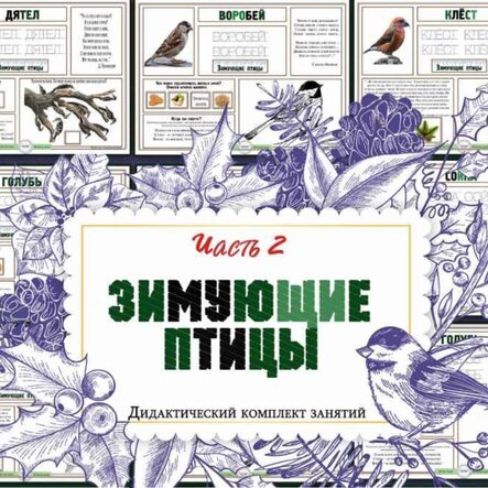 В комплект входят 14 зимующих птиц: дятел, сойка, щегол, клёст, свиристель и другие.