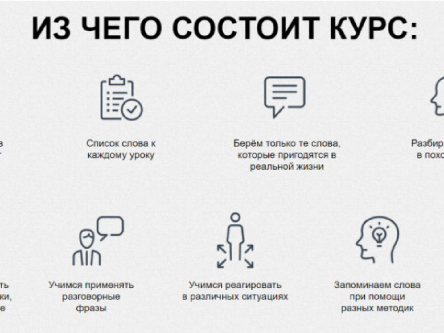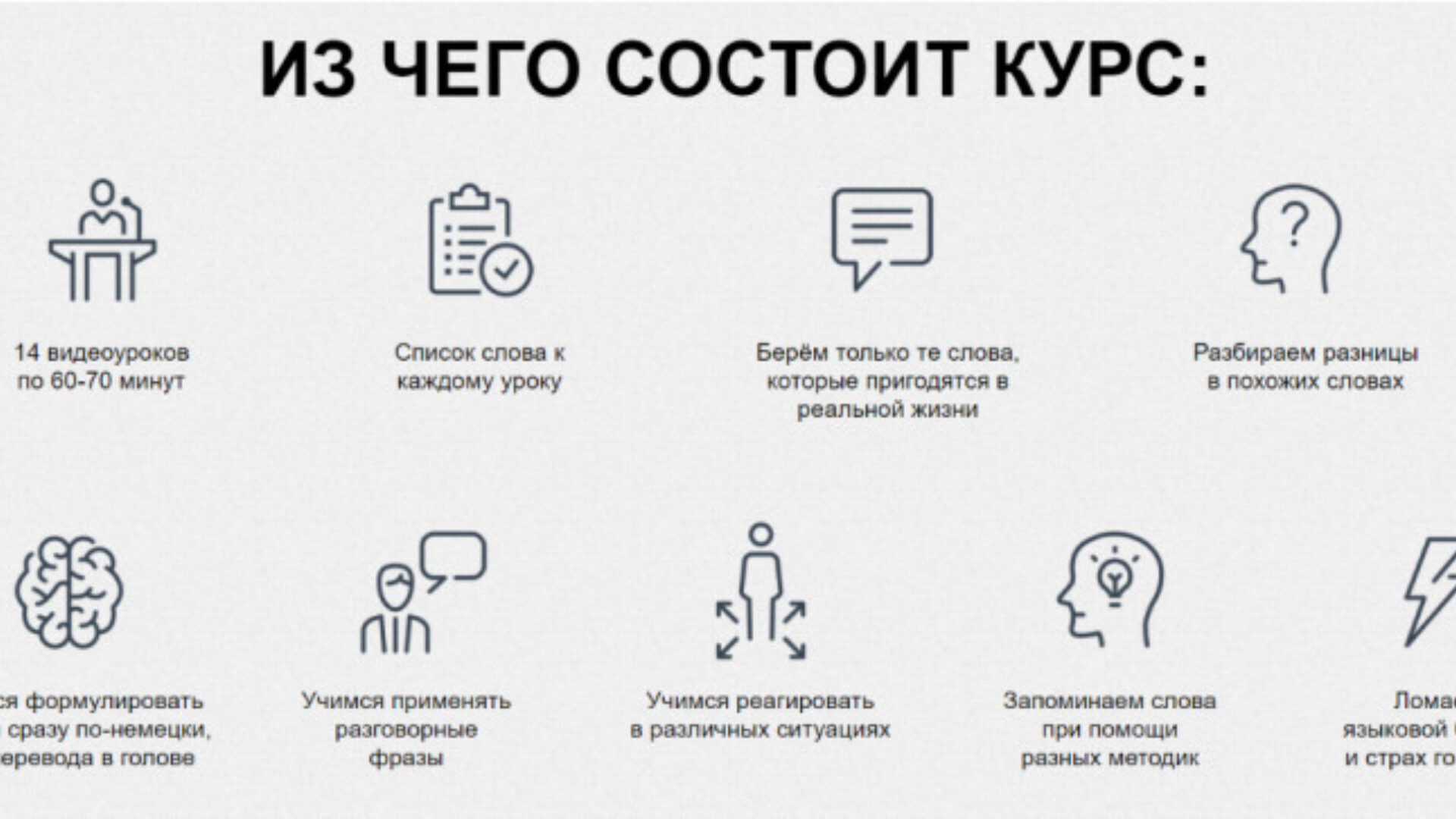 КОМУ ПОДОЙДЕТ ЭТОТ КУРС Курс рассчитан на тех, кто никогда не учил немецкий язык или имеет самые базовые знания. Тем, кто не умеет читать или не знает правил чтения. Если Ваш словарный запас не более 30-50 слов. Людям в возрасте от 20 до 80 лет. Материал объясняется простым языком без сложных