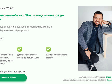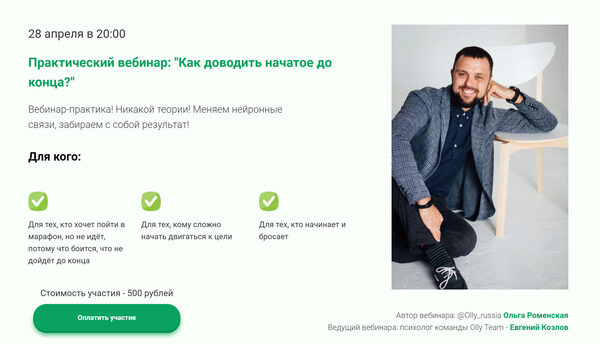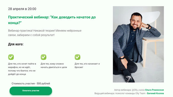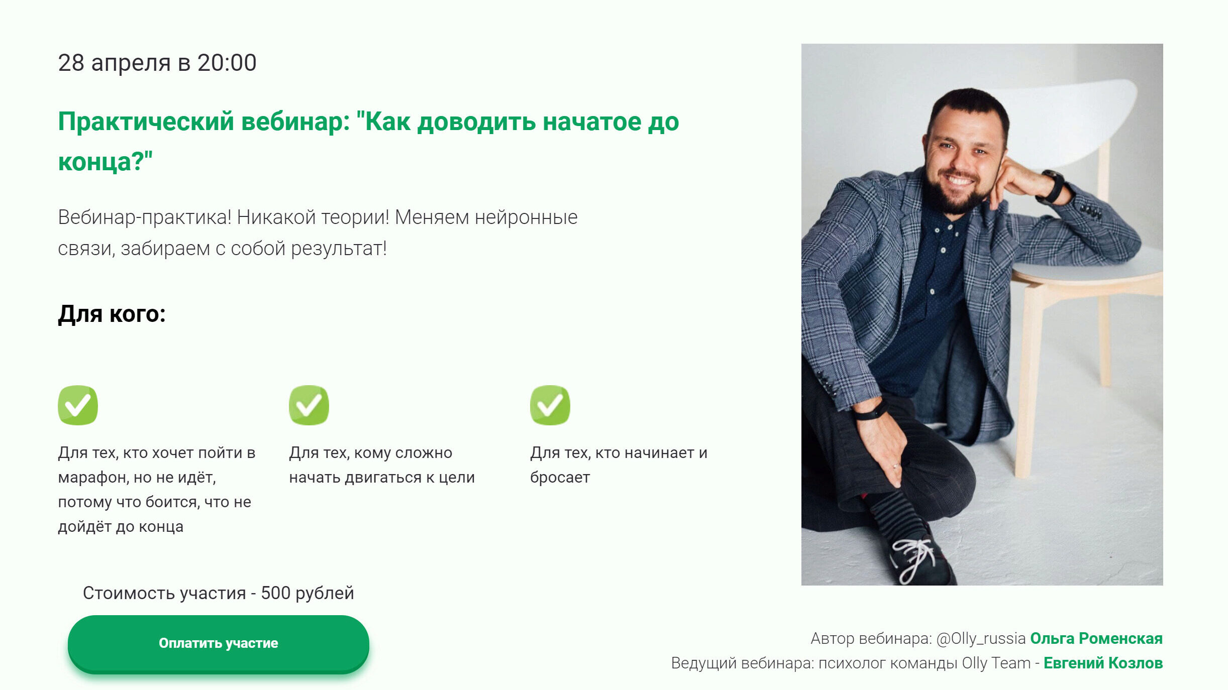 "Легендарный вебинар, автором которого являюсь я (@Olly_russia - Ольга Роменская), в этот раз проведёт в живом формате психолог моей команды - Женя Козлов.