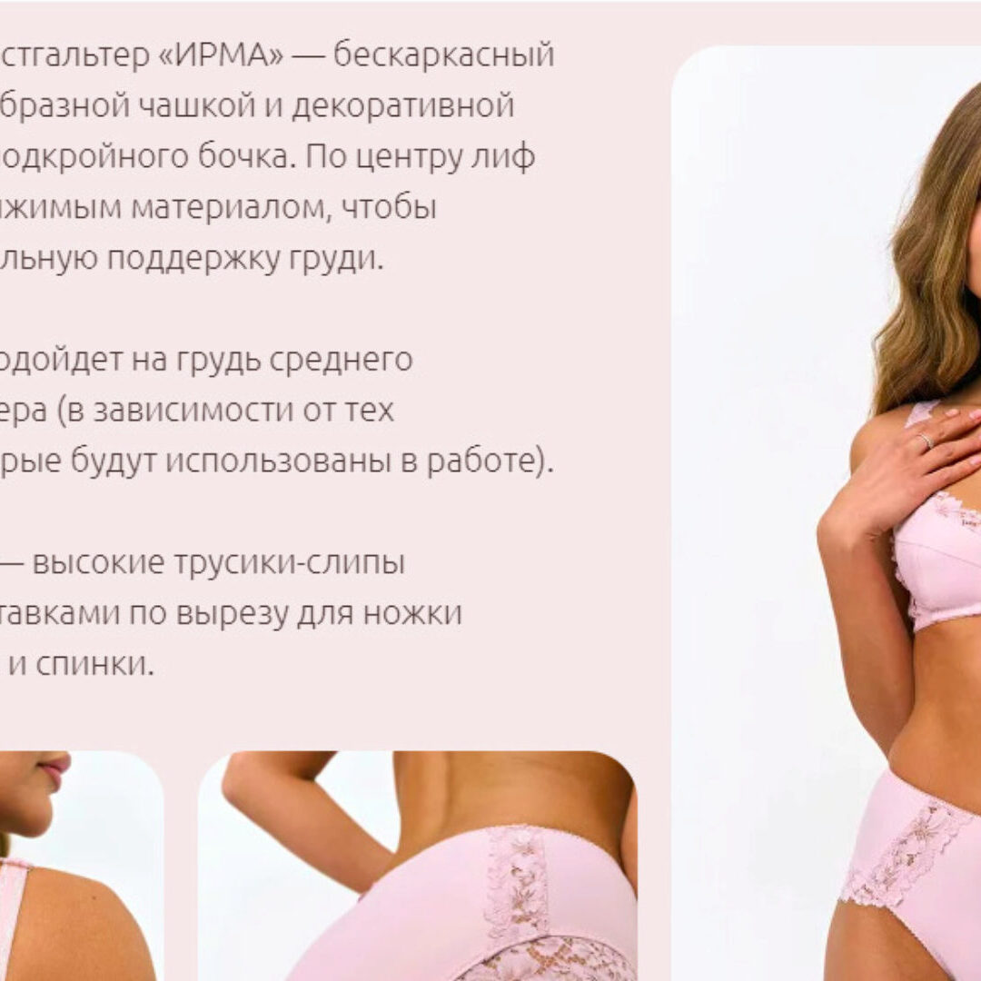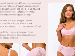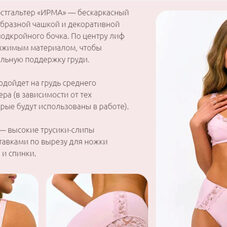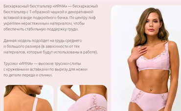 Бескаркасный бюстгальтер «ИРМА» — бескаркасный бюстгальтер с Т-образной чашкой и декоративной вставкой в виде подкройного бочка. По центру лиф укреплен нерастяжимым материалом, чтобы обеспечить стабильную поддержку груди.
