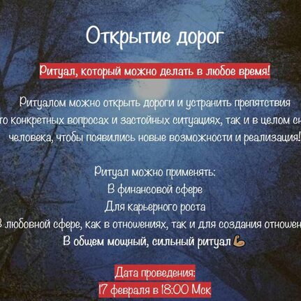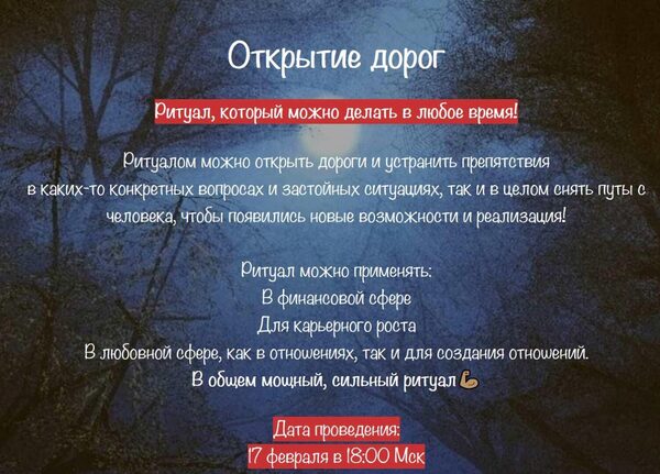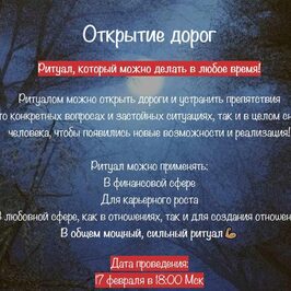Ритуал на открытие дорог на год Ритуал, который заложит новые этапы в вашей жизни, откроет к ним двери, чтобы в нужный момент все свершилось. Как Вы желаете, без вреда и на благо.
