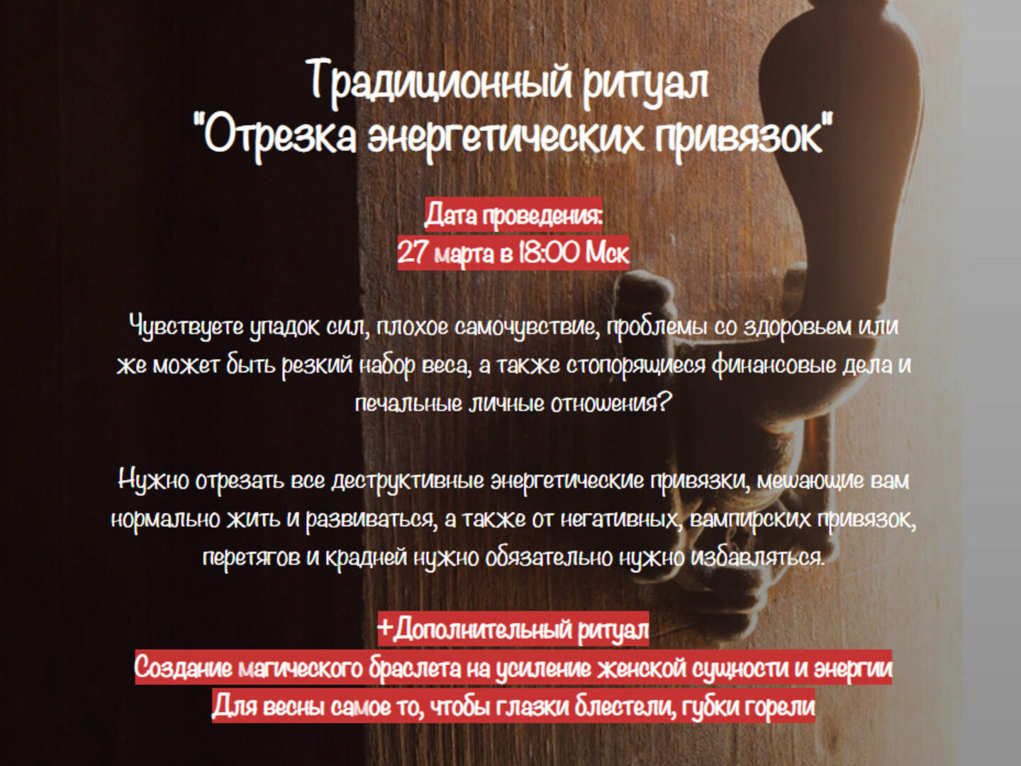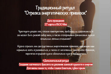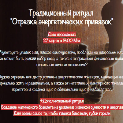 Чувствуете упадок сил, плохое самочувствие, проблемы со здоровьем или же может быть резкий набор веса, а также стопорящиеся финансовые дела и печальные личные отношения? Нужно отрезать все деструктивные энергетические привязки, мешающие вам нормально жить и развиваться, а также от негативных,