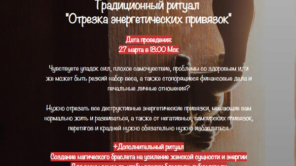 Традиционный ритуал «Отрезка энергетических привязок» Чувствуете упадок сил, плохое самочувствие, проблемы со здоровьем или же может быть резкий набор веса, а также стопорящиеся финансовые дела и печальные личные отношения? Нужно отрезать все деструктивные энергетические привязки, мешающие вам