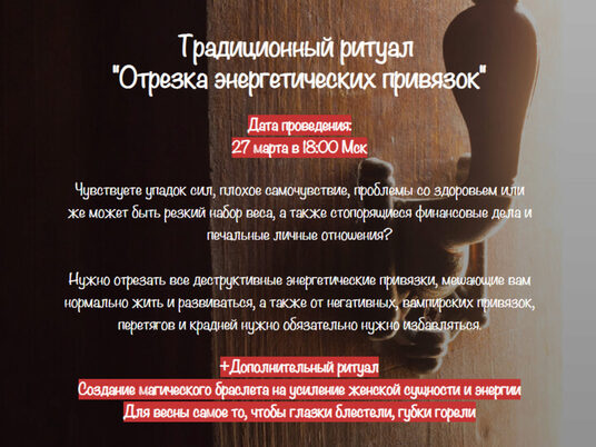 Приглашаю вас совершить традиционный ритуал «Отрезки негативных энергетических привязок» Мы с вами его уже делаем уже более полугода, ритуал имеет накопительный эффект, поэтому его нужно повторять, хотя бы раз в месяц. Сделаем как всегда на сильном круге на моей и вашей силе +Дополнительный ритуал