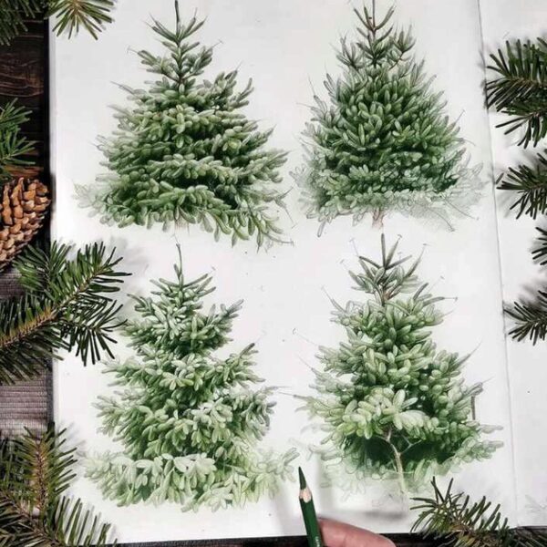 выполним небольшой предварительный набросок ветви ели простым карандашом,