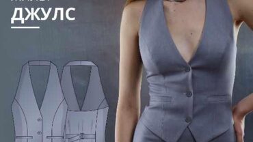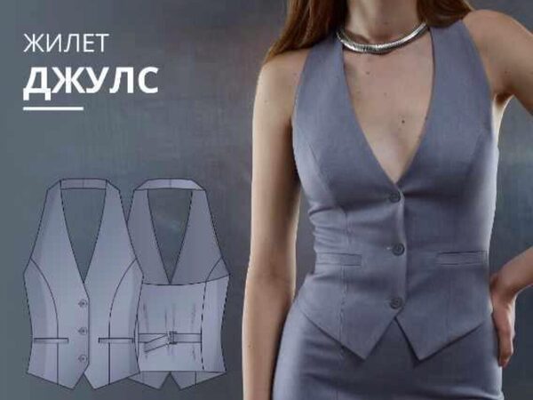 Выкройка жилета малого объема прилегающего силуэта. На полочках имитация прорезных карманов с листочкой с втачными концами. Нагрудные вытачки переведены в рельефы. Жилет на притачной подкладке. Спинка, открытая с рельефами, на уровне талии два хлястика с рамками. Вырез горловины глубокий,