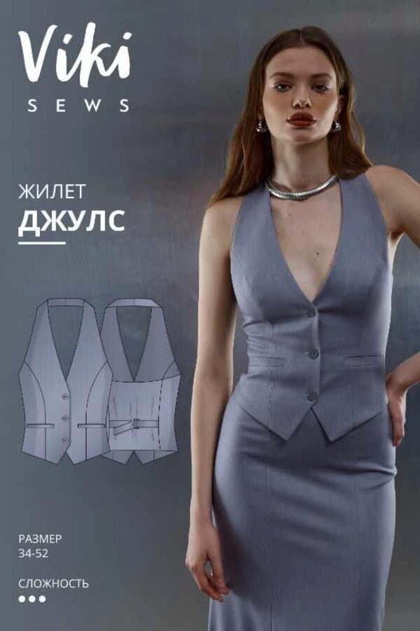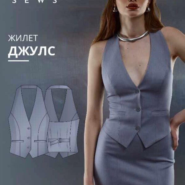 Выкройка жилета малого объема прилегающего силуэта. На полочках имитация прорезных карманов с листочкой с втачными концами. Нагрудные вытачки переведены в рельефы. Жилет на притачной подкладке. Спинка, открытая с рельефами, на уровне талии два хлястика с рамками. Вырез горловины глубокий,