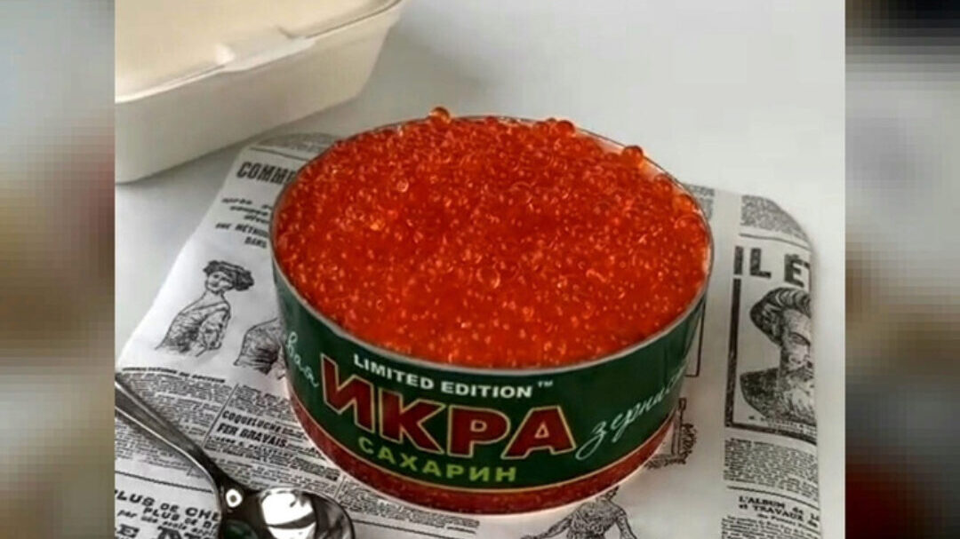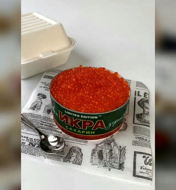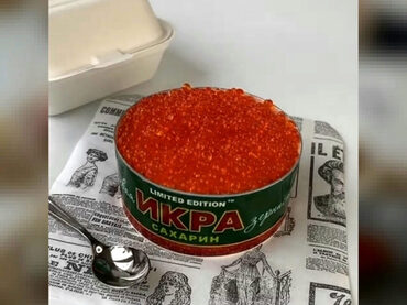 - Видео-урок по приготовлению бенто-торта «Банка с икрой»: миндальный бисквит; взбитый карамельный ганаш; карамель; имитация икры для декора торта