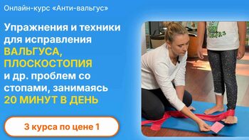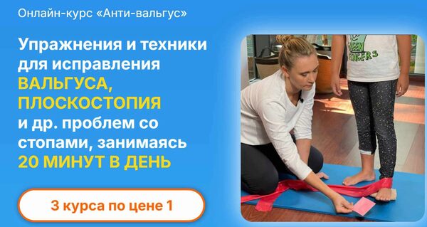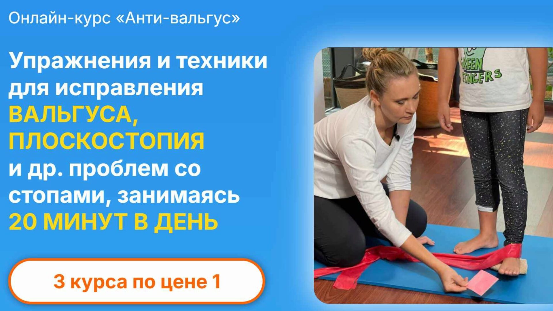 Узнайте, как исправить вальгус, плоскостопие и другие проблемы со стопами ребенка с помощью домашних упражнений по 15 минут в день Курс «Анти-вальгус» для вас, если у ребенка есть один или несколько из перечисленных признаков: Обувь стаптывается на одну сторону Стопы заваливаются внутрь Походка