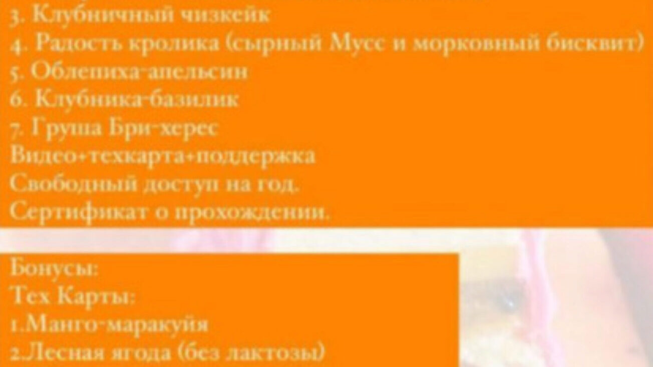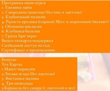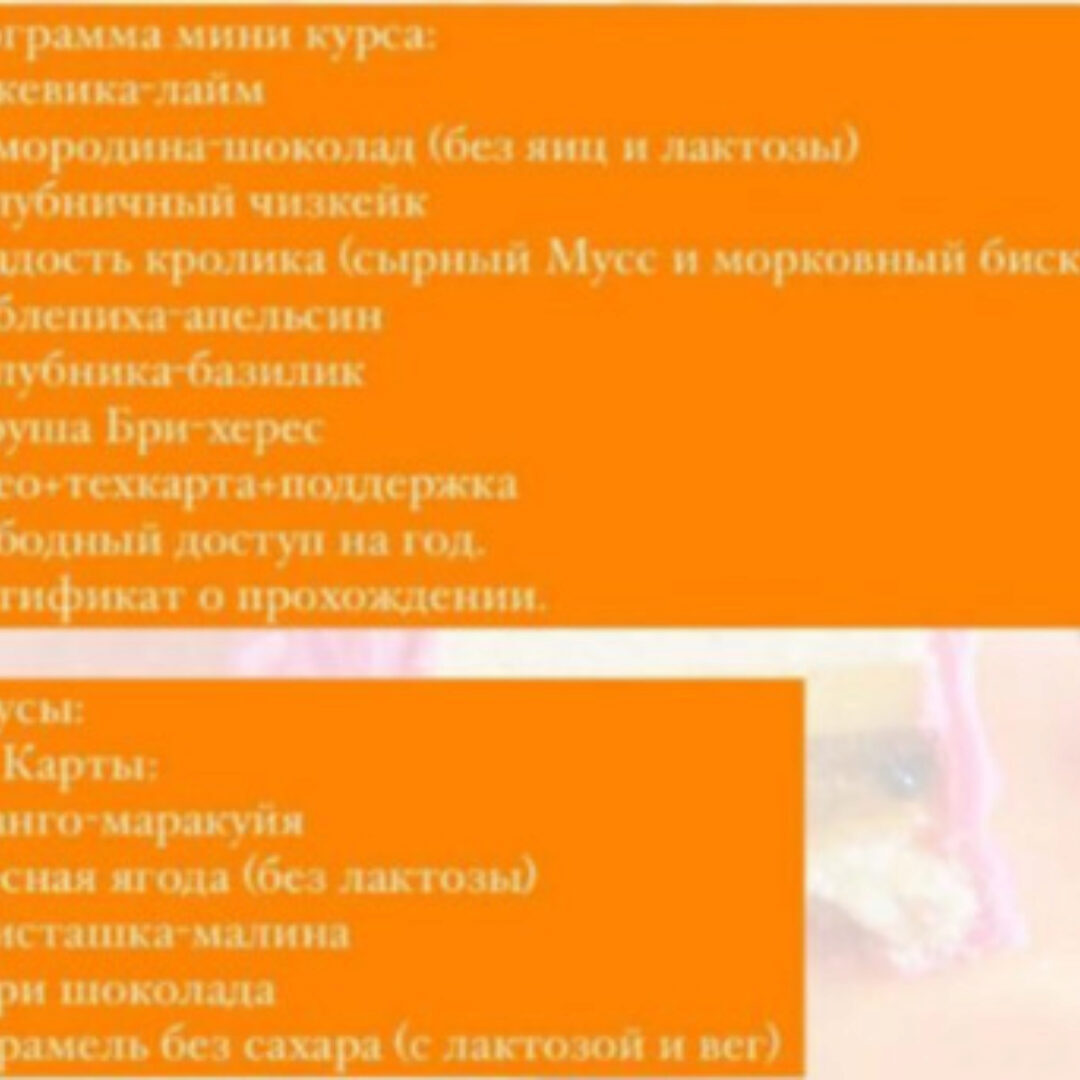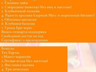 Программа курса: - Пирожное «Манго-Малина» - Пирожное «Апельсин в шоколаде» - Пирожное «Клубничный йогурт с лаймом» - Пирожное «Кокосовый чизкейк с вишней» - Пирожное « Шоколад-Фундучная карамель» Все пирожные подходят под заморозку