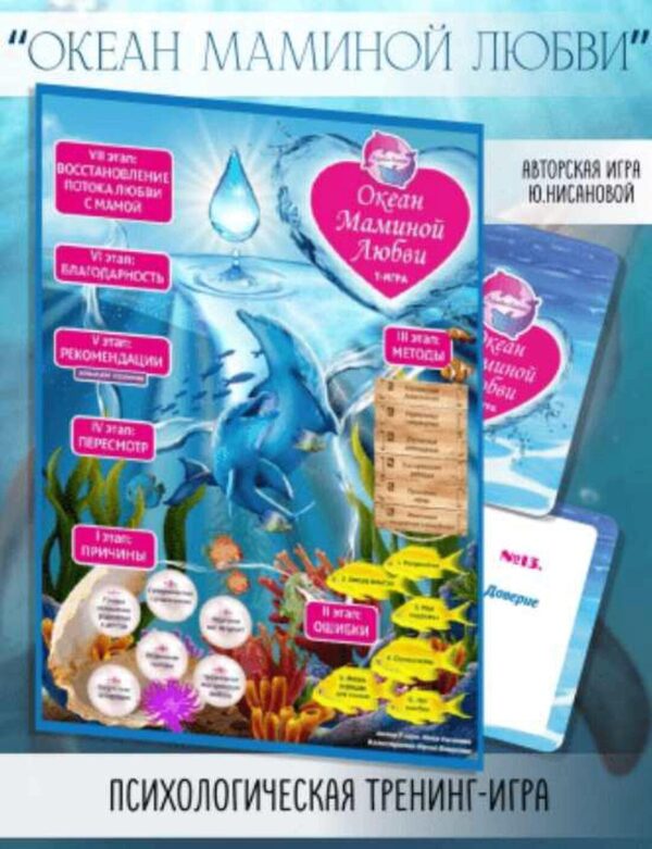 Автор: Юлия Нисанова (психолог, сертифицированный специалист по ЭОТ и работе с МАК, автор психологической игры «Океан маминой любви», обучающий тренер школы игропрактики «Игры Жизни».) Комплектация: игровое поле формат А1 (61х82 см); игровой кубик на 6 граней; инструкция с описанием игры; папка А4;