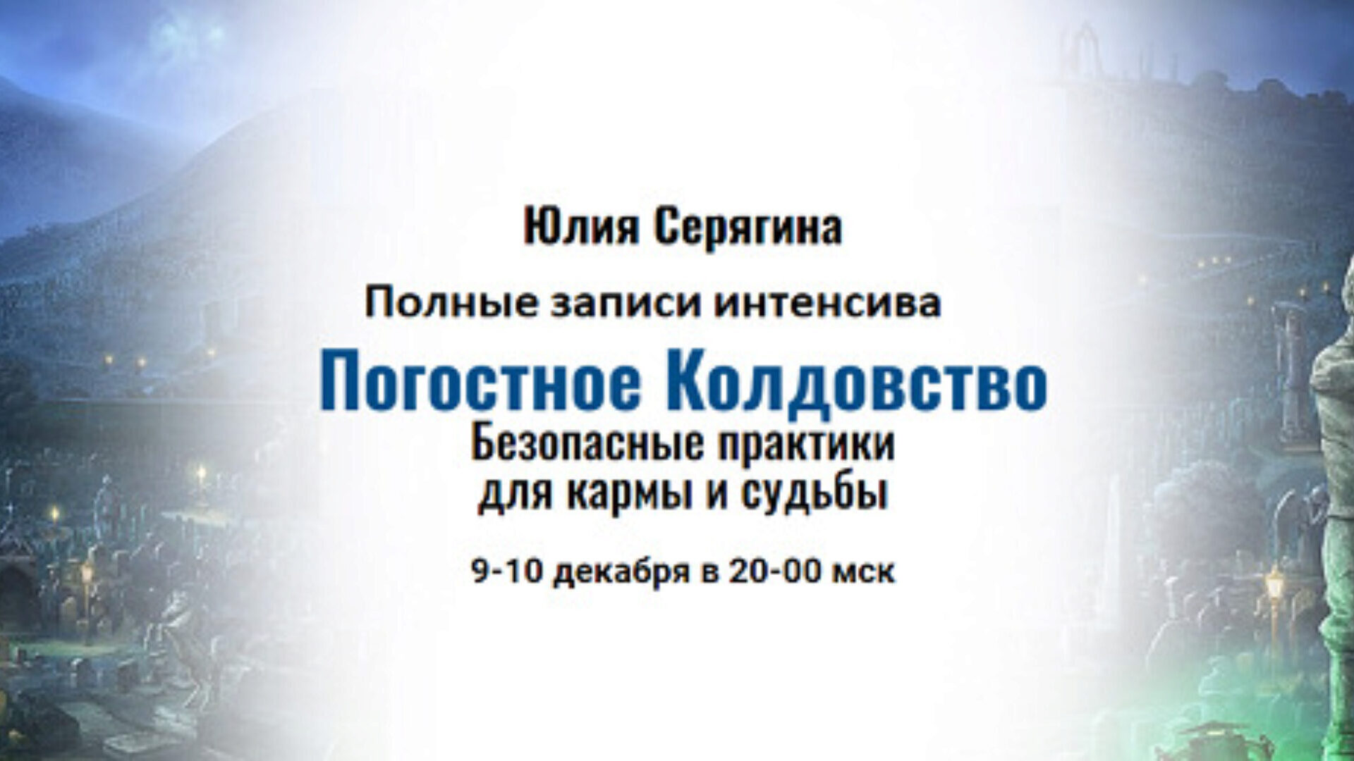 Вас ждут следующие темы: Какие сферы может исправить Магия Погоста Кому нельзя ходить по погост Чем отличается погост от кладбища В конце занятия вас ждет приятный бонус — Энергетическая практика «Защита энергококона». Новый вариант. За два дня интенсива вы узнаете: