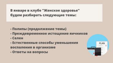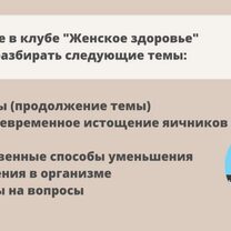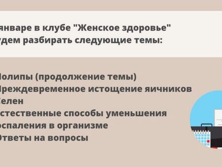 Каждый месяц клуб пополняется новыми материалами на различные темы, касающимися: - гинекологих заболеваний (полипы, миомы, эндометриоз и др.) - как понять результаты анализов и диагностик - восполнение дефицитов для улучшения качества жизни и предотвращения проблем с женскими заболеваниями - общего