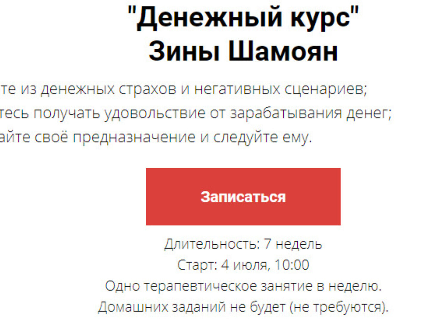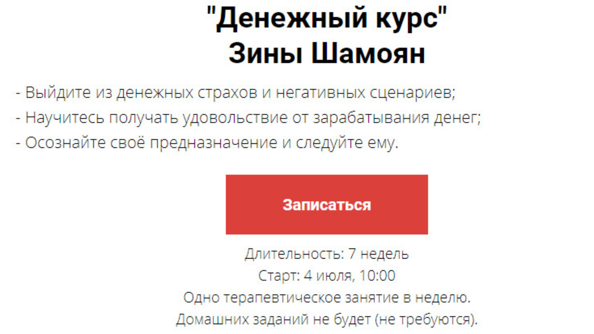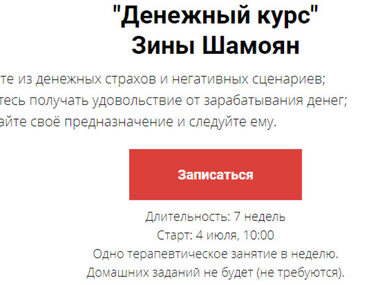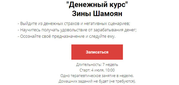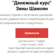 «Денежный курс» Зины Шамоян - это глубокая терапия, которая может существенно изменить ваше внутреннее состояние, отношение к себе, к деньгам и к миру в целом.