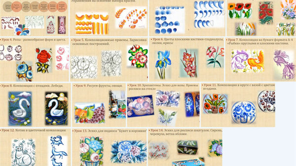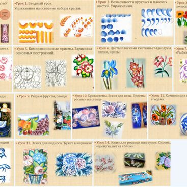 Чему обучают на курсе: Подбирать и подготавливать материалы для росписи: краски, кисти, лаки, заготовки. Правильной постановке руки и работе с кистями для росписи. Изображению базовых приемов работы с красками и кистями. Написанию цветов, листьев, травинок и других элементов росписи, изящных
