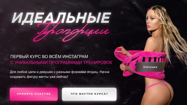 пакет Базовый 3 вида программы с резинками, дома, в зале 30 видео тренировок с голосовым сопровождением тренера Меню на месяц Этот курс для тебя, если: ты устала от апельсиновой корки на ягодицах и дрябышей на бедрах хочешь похудеть/набрать вес и подтянуть тело с акцентом на ягодицы хочешь сделать